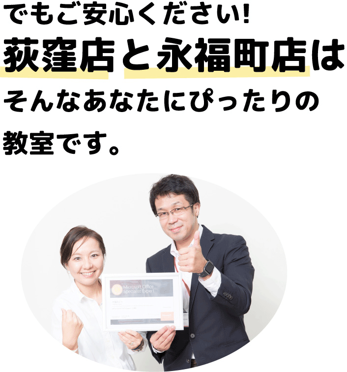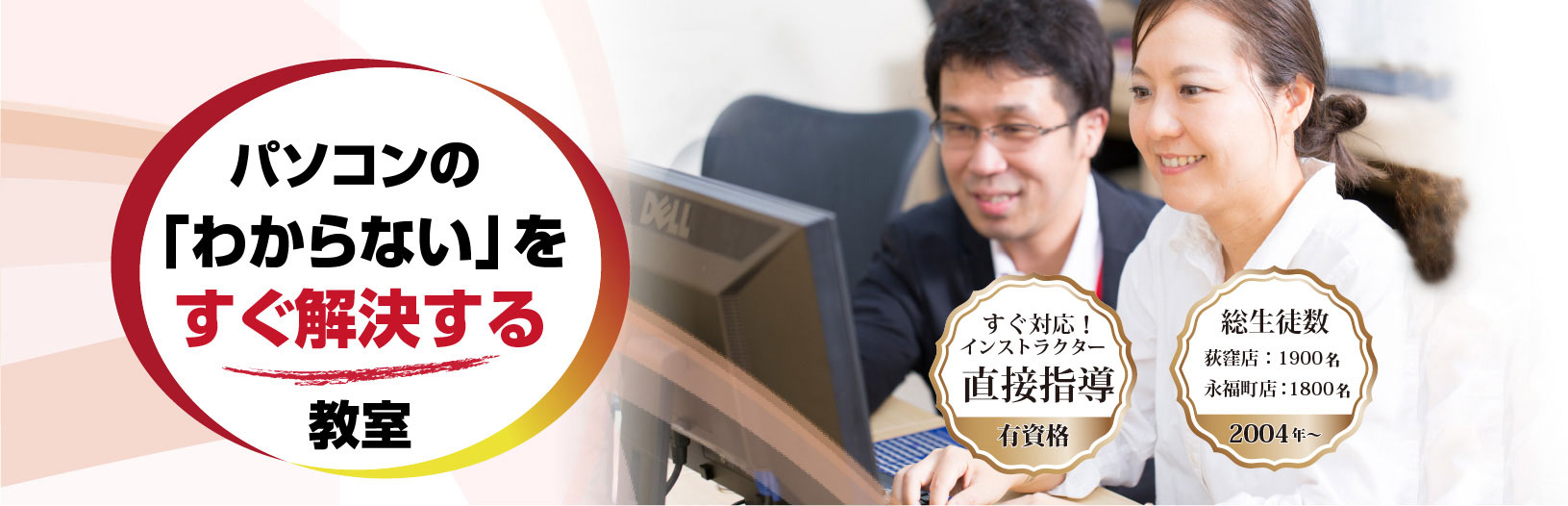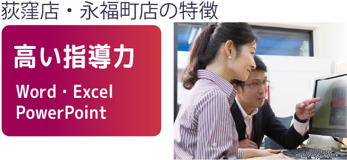 MOS資格は99%の生徒を合格までサポート、Excel、Word、PowerPointの仕事で必須のスキルから、IllustratorやPhotoshopのデザインスキル、WordPressなどのホームページ制作や生成AI、Canvaなど最新の技術にも精通しています。パソコンの様々なトラブルなどにも即対応、杉並区の寺子屋的な存在としてもご利用いただいております。