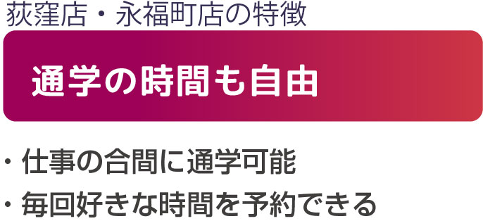 仕事や家事、学校の予定に合わせて、都合のよい時間に通うことができます。