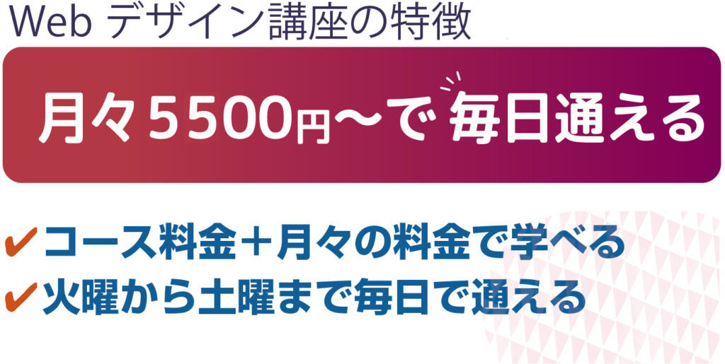 入学時に学びたいコースを選んでいただいた後は月々の受講料のみで毎日通えます。