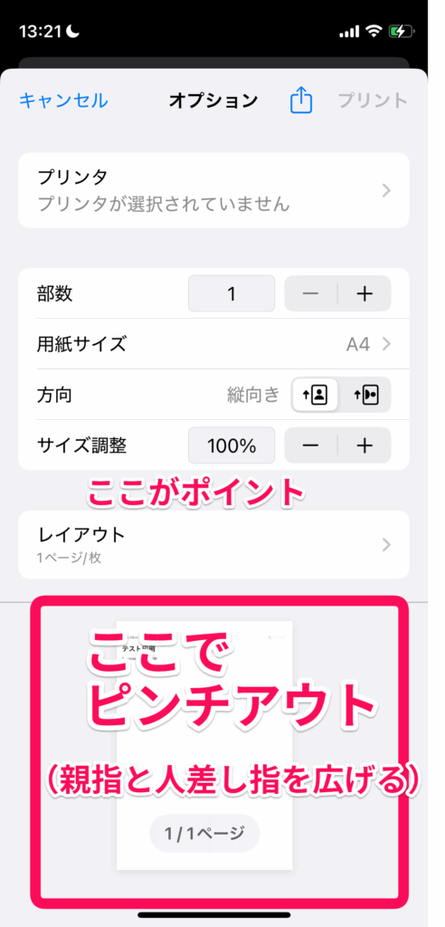 画面の印刷プレビューを2本指で広げる(ピンチアウト)と、PDFファイルが生成されます。