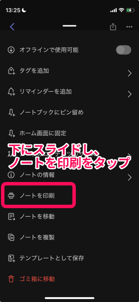 Step2:メニューの下の方にある「ノートを印刷」をタップ