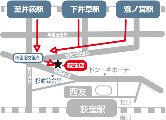 井荻駅、下井草駅、鷺ノ宮駅方面から荻窪店までの行き方