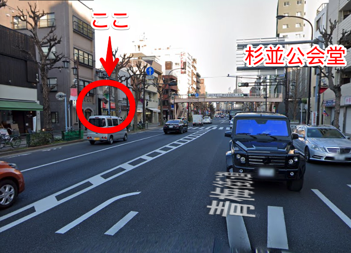 下井草や鷺ノ宮方面からいらっしゃる方は日大二校通りを荻窪方向にまっすぐ直進してください。