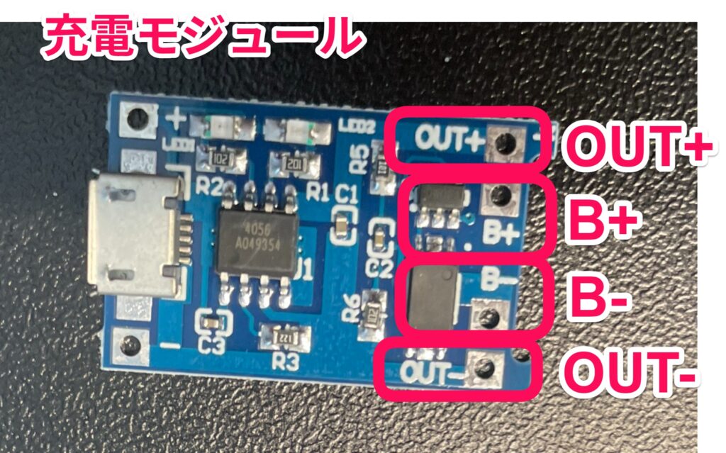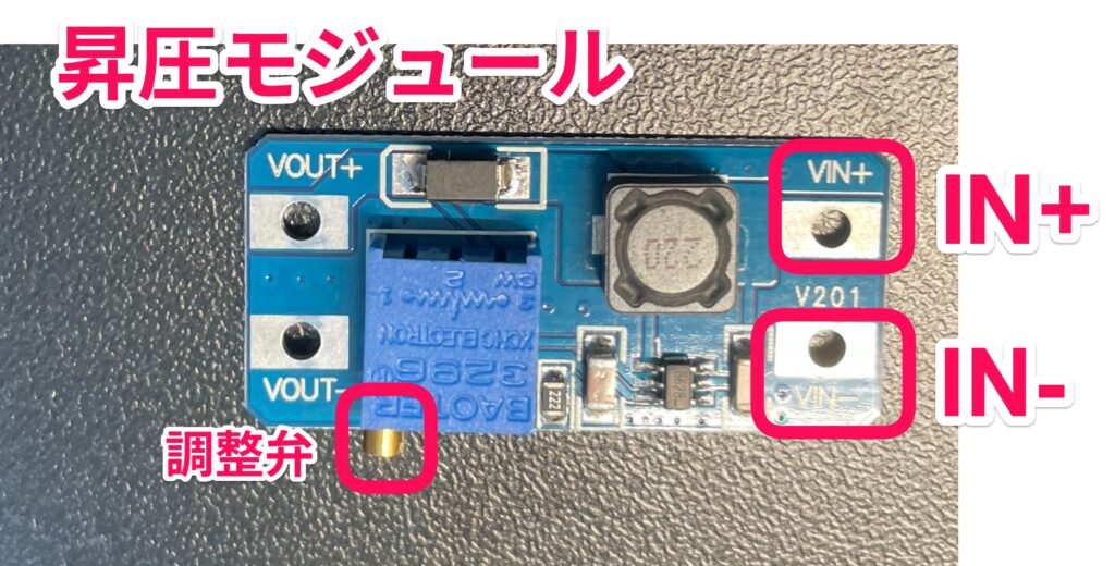 昇圧モジュールの力を借りて、3.7Vを5Vに調整していきます。