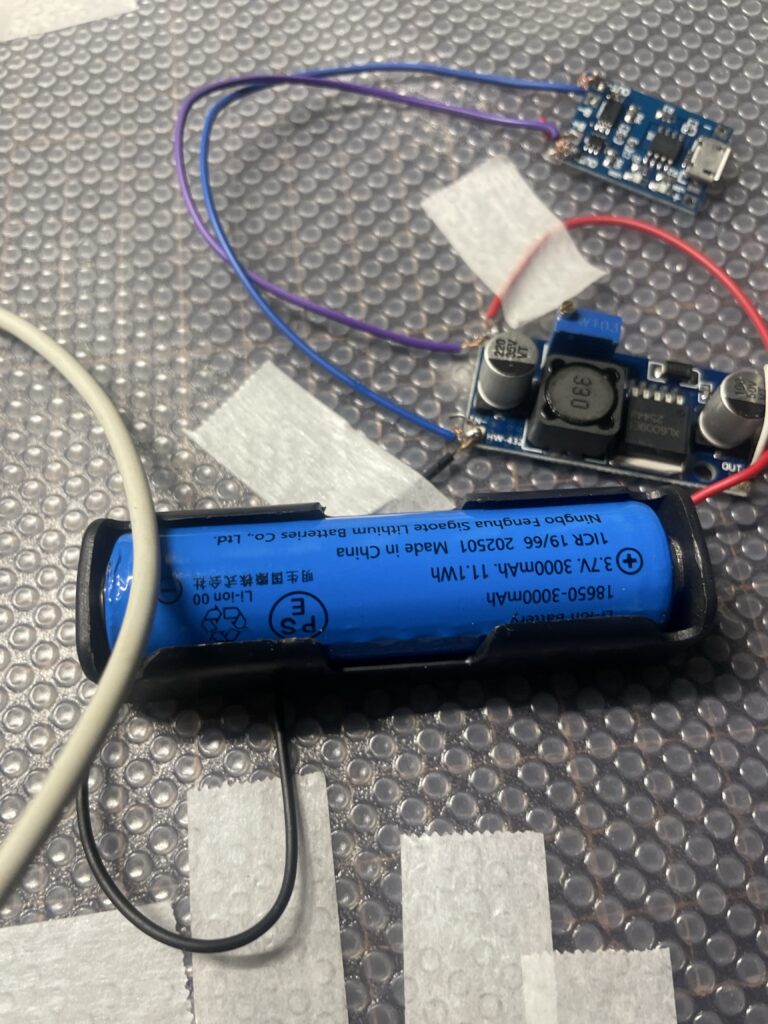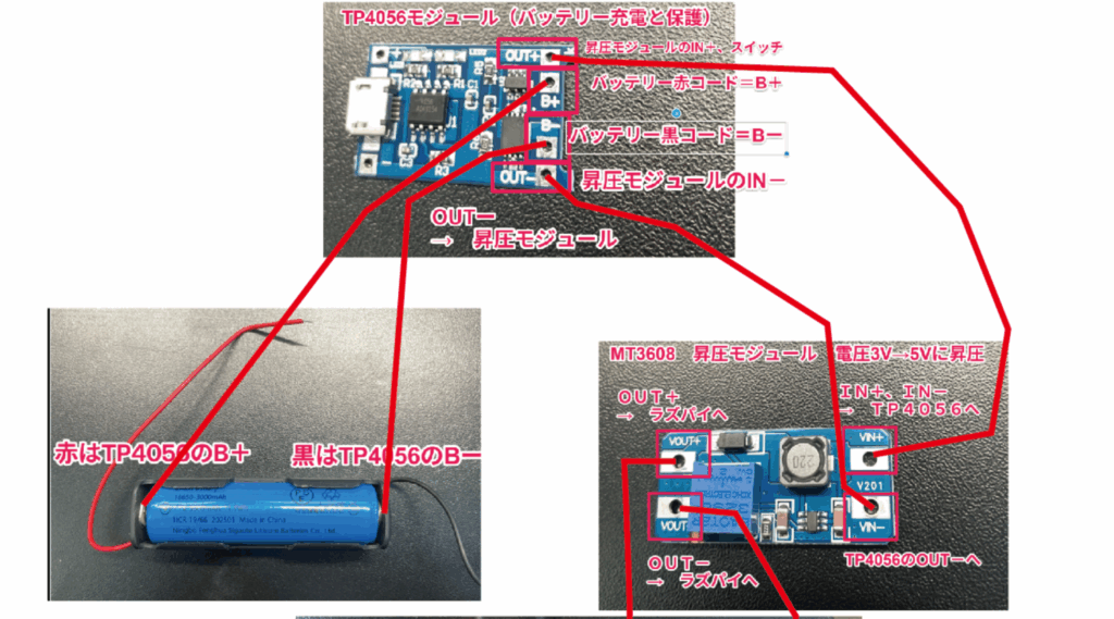 電池 → 充電モジュール → 昇圧モジュール → ラズパイ