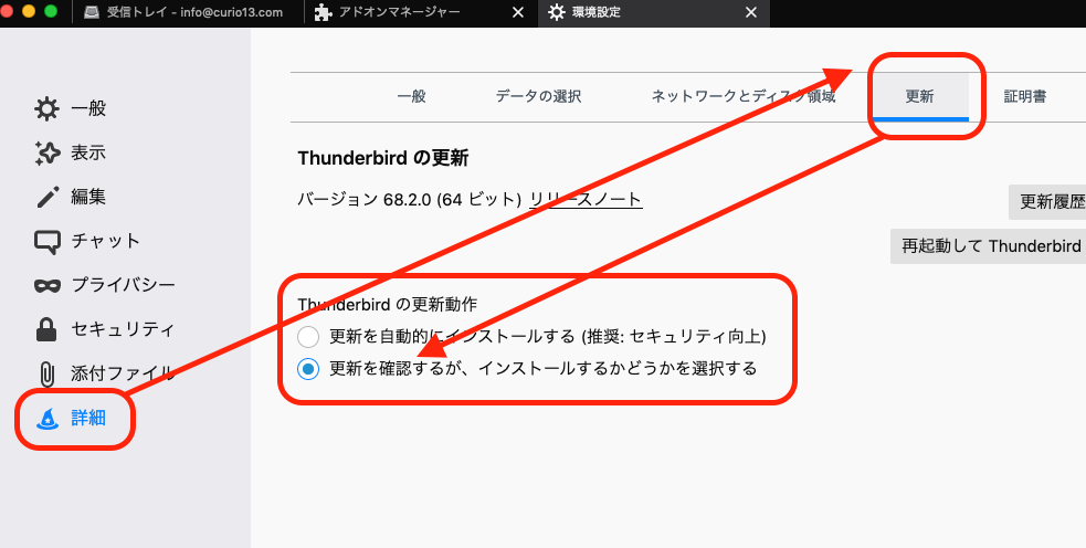 環境設定の詳細から更新をえらび、自動的にアップデートをインストールしないように設定しましょう。