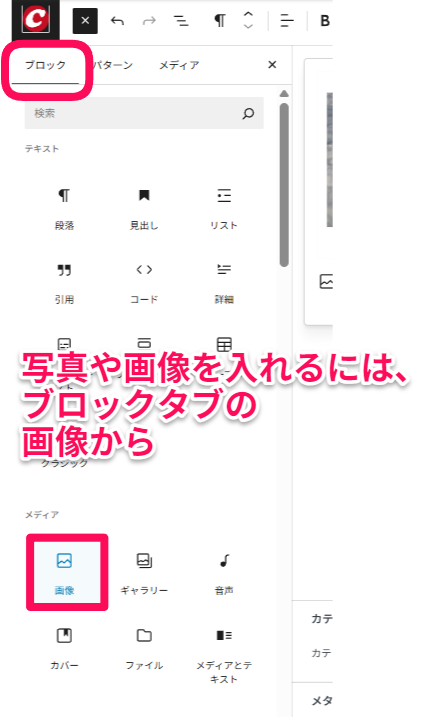 画像を挿入するにはブロックタブにある画像から行えます。