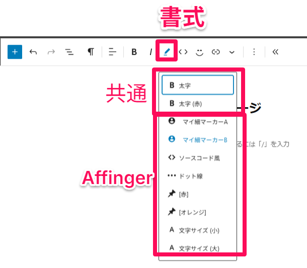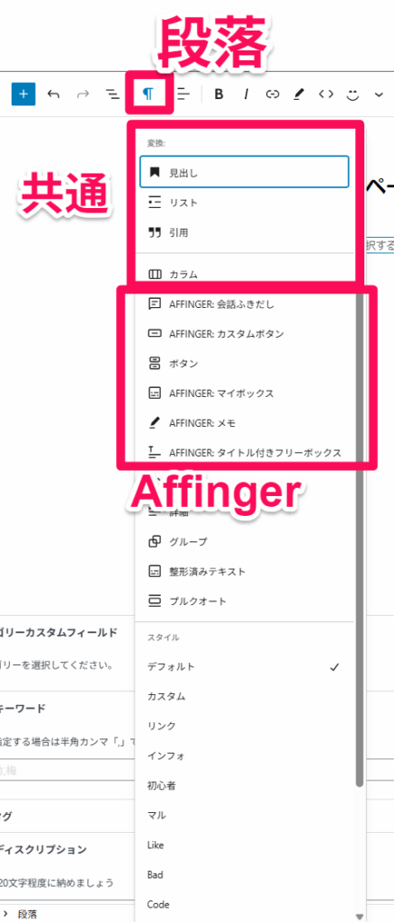 見出しやカラムは共通、中断からAffinger独自のツールになります。