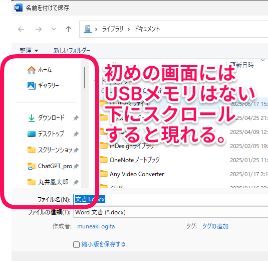 あと、保存先の一覧でUSBメモリは画面の下の方に表示されることが多いから、