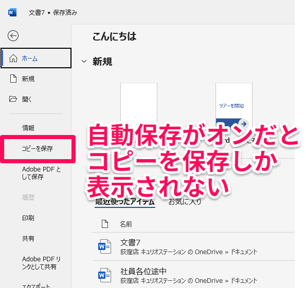 最近のWordやExcelでは、クラウド保存が初期設定になっていることがあります。