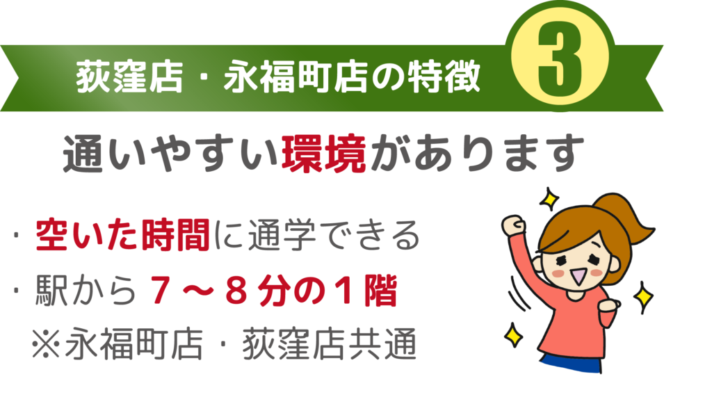 生徒様の都合の良い時間に毎回予約を入れられます。またお仕事の空いた時間に通えるように時間の調整もお気軽にできますので安心して通学できます。